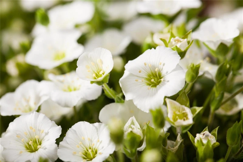 Das Berg-Sandkraut ‚Blizzard Compact‘ (Arenaria montana) ist eine polsterbildende wintergrüne Staude, die von Mai bis August weiße, schalenförmige Blüten bildet. An einem sonnigen bis halbschattigen Standort mit durchlässigem, kalkhaltigem Boden erreicht es gewöhnlich eine Höhe von ca. 30 cm und wird ca. 30 cm breit. Das Berg-Sandkraut ‚Blizzard Compact‘ ist gut frostverträglich.
