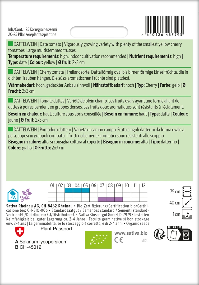 Freilandsorte. Dattelförmig oval bis birnenförmige Einzelfrüchte, die in dichten Trauben hängen. Die süss-aromatischen Früchte sind platzfest.
