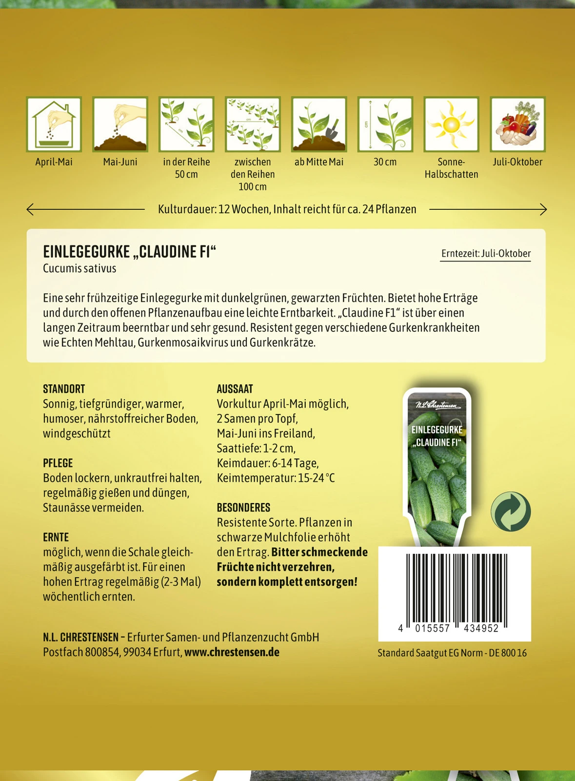 Eine sehr frühzeitige Einlegegurke mit dunkelgrünen, gewarzten Früchten. Bietet hohe Erträge und durch den offenen Pflanzenaufbau, eine leichte Erntbarkeit. „Claudine F1“ ist über einen langen Zeitraum beerntbar und sehr gesund. Resistent gegen verschiedene Gurkenkrankheiten wie Echten Mehltau, Gurkenmosaikvirus und Gurkenkrätze.