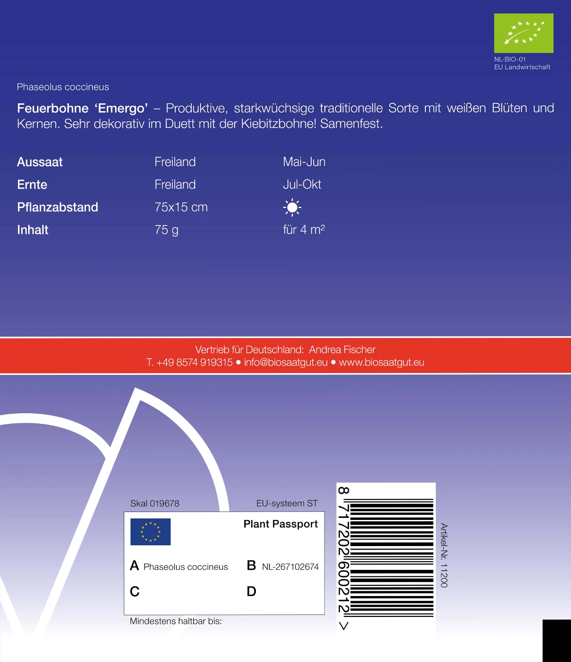 Produktive, starkwüchsige traditionelle Sorte mit weißen Blüten und Kernen. Sehr dekorativ im Duett mit der Kiebitz Bohne. Samenfest.
