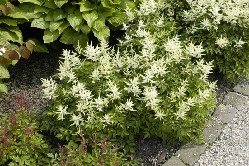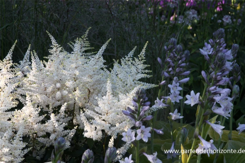 Astilbe japonica ‚Washington‘ bildet in Rispen angeordnete, weiße Blüten ab Juni.