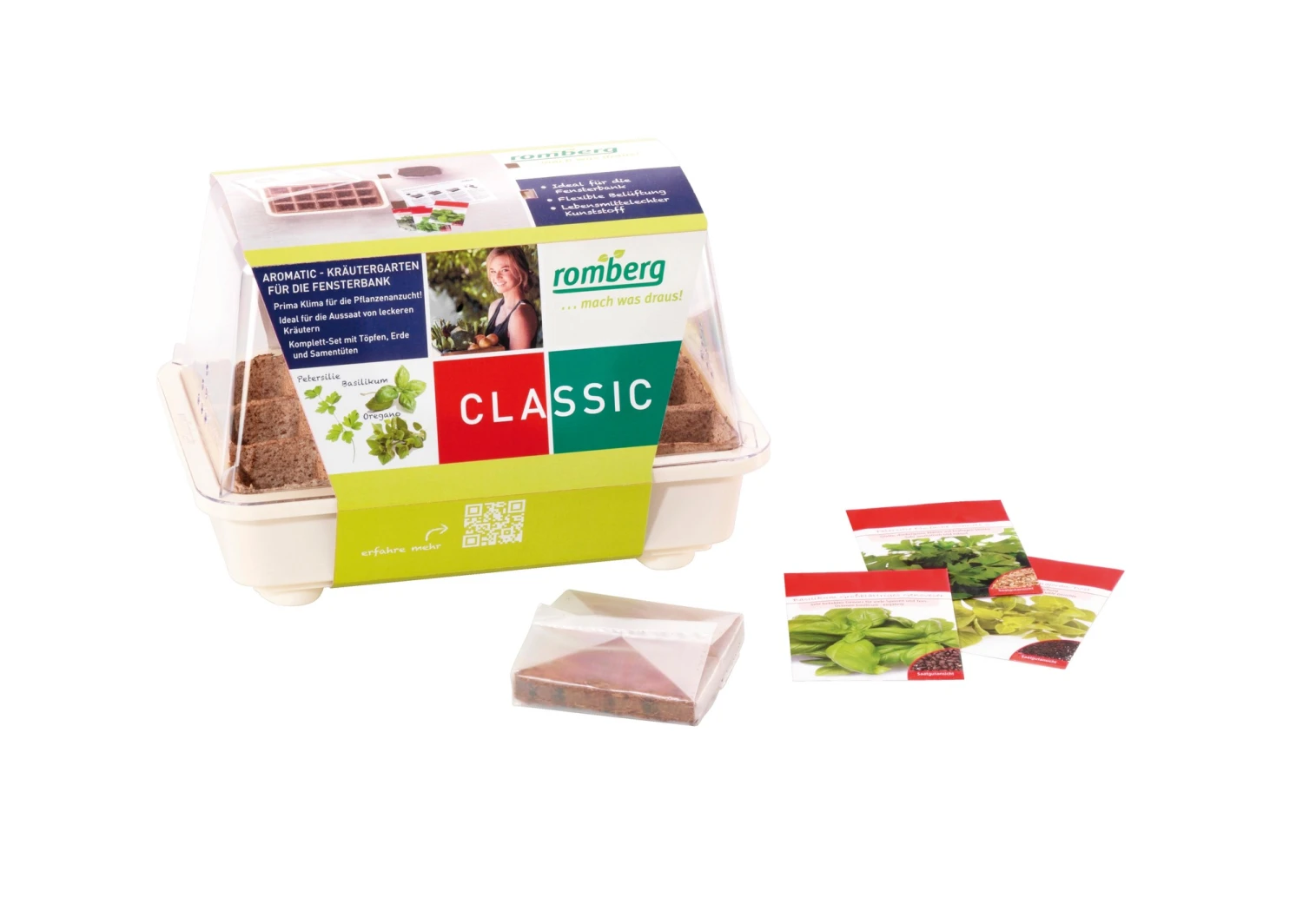Set inkl. 15 Anzuchttöpfen, 3 Tütchen Kräutersamen und passender Anzuchterde. Ideal für die Fensterbank – Kondenswasser läuft vom Deckel in die Schale zurück