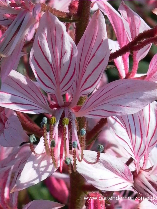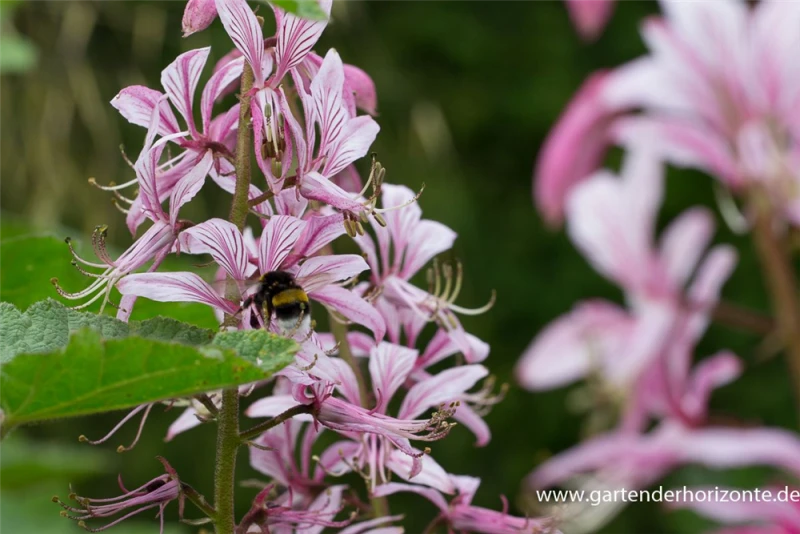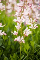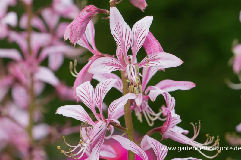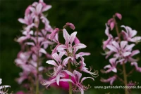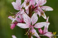 Dictamnus albus bildet in Rispen angeordnete, rosafarbene Blüten ab Juni. Diese verströmen einen angenehmen Duft.