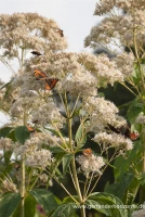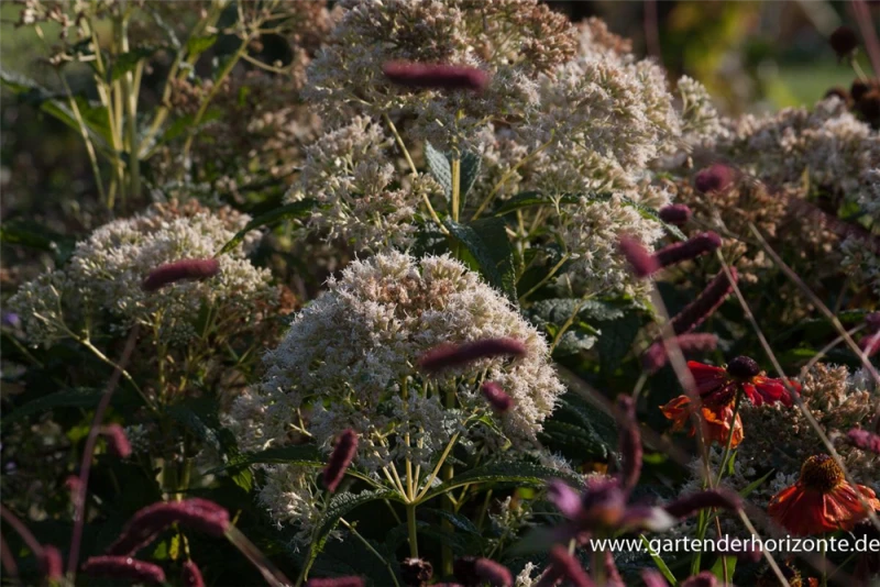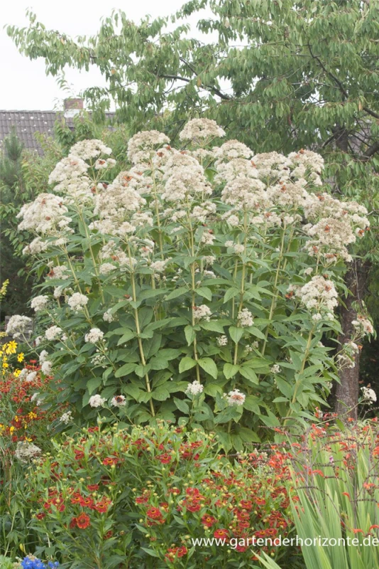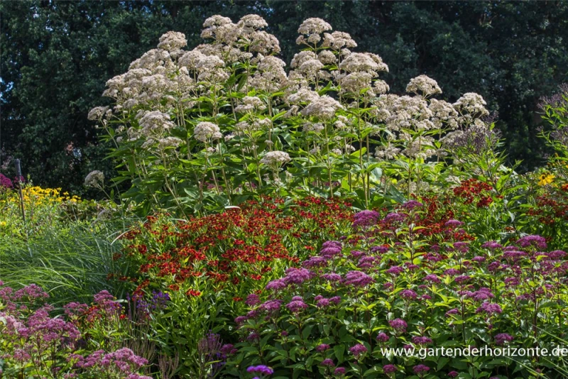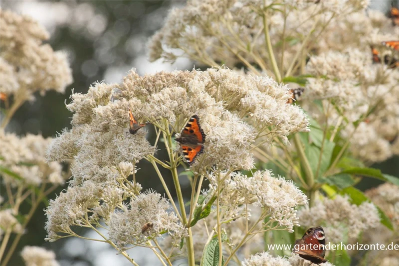 Der Große Garten-Wasserdost ‚Bartered Bride‘ (Eupatorium fistulosum) ist eine aufrechte Staude, die von Juli bis September weiße, in Doldentrauben angeordnete Blüten mit einem angenehmen Duft bildet. An einem sonnigen bis halbschattigen Standort mit durchlässigem, nährstoffreichem Boden erreicht er gewöhnlich eine Höhe von ca. 1,8 m und wird ca. 1 m breit. Der Große Garten-Wasserdost ‚Bartered Bride‘ ist gut frostverträglich.