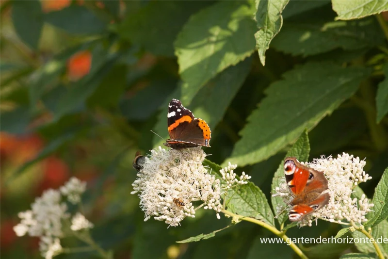 Eupatorium fistulosum ‚Bartered Bride‘ bildet in Doldentrauben angeordnete, weiße Blüten ab Juli. Diese verströmen einen angenehmen Duft.