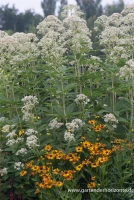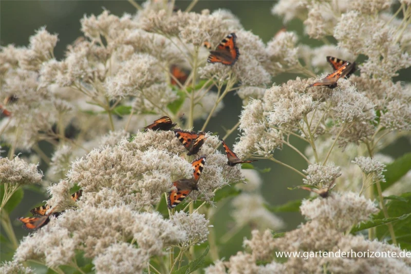 Der Große Garten-Wasserdost ‚Album‘ (Eupatorium fistulosum) ist eine aufrechte Staude, die von Juli bis September weiße, in Doldentrauben angeordnete Blüten mit einem angenehmen Duft bildet. An einem sonnigen bis halbschattigen Standort mit durchlässigem, nährstoffreichem Boden erreicht er gewöhnlich eine Höhe von ca. 1,8 m und wird ca. 1 m breit. Der Große Garten-Wasserdost ‚Album‘ ist gut frostverträglich.