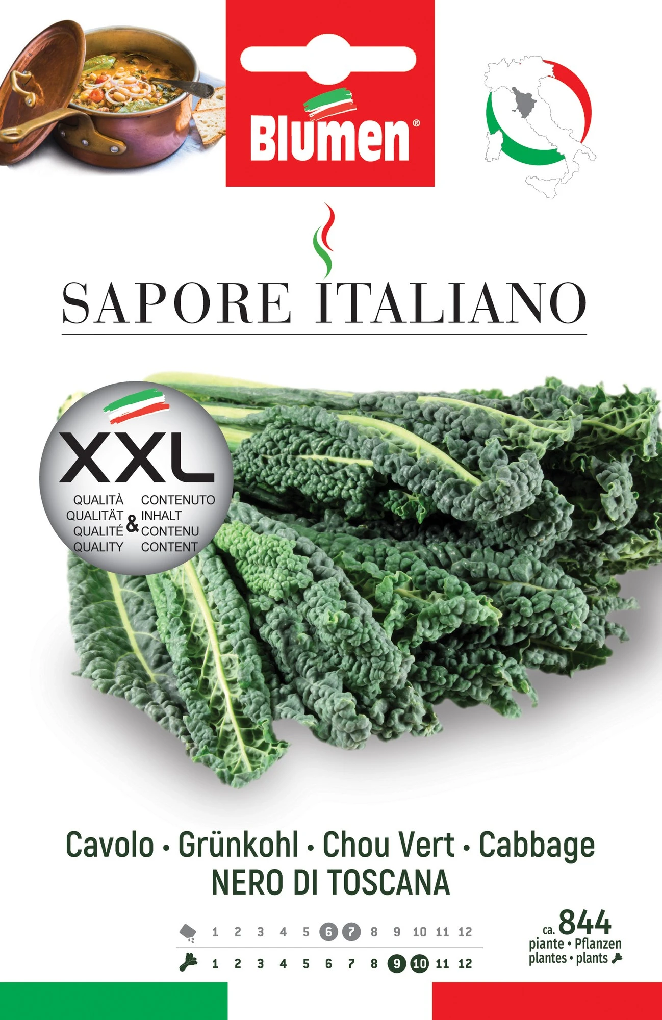 Bildet einen Kopf mit langen, sehr dunkeln und blasigen Blättern. Eignet sich ausgezeichnet für Gemüsesuppen, wie beispielsweise die „Ribollita“ aus der Toskana.