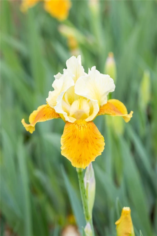 Iris x germanica ‚Tulip Festival‘ bildet lippenförmige, blaue, violette, lilafarbene, weiße, gelbe, gelb-weiße Blüten ab Mai.
