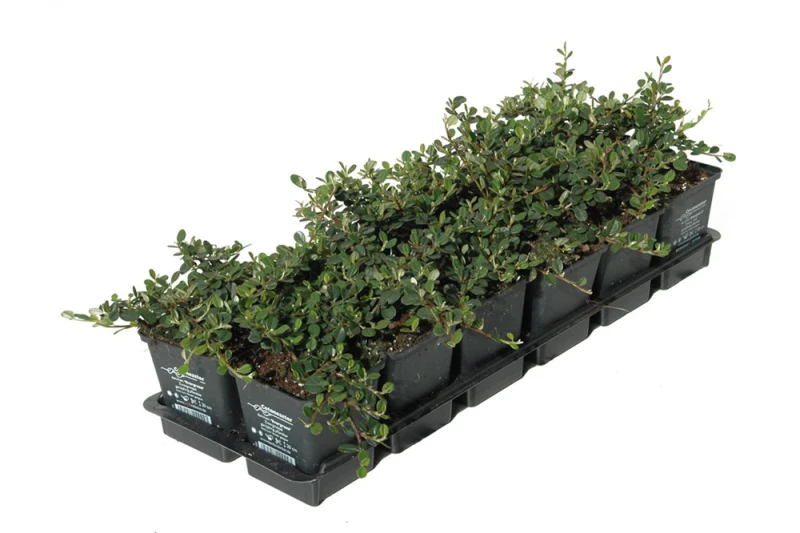 Kompakter sehr flacher Wuchs, sehr kleinblättrig, grünes Laub, rötliche Winterfärbung.