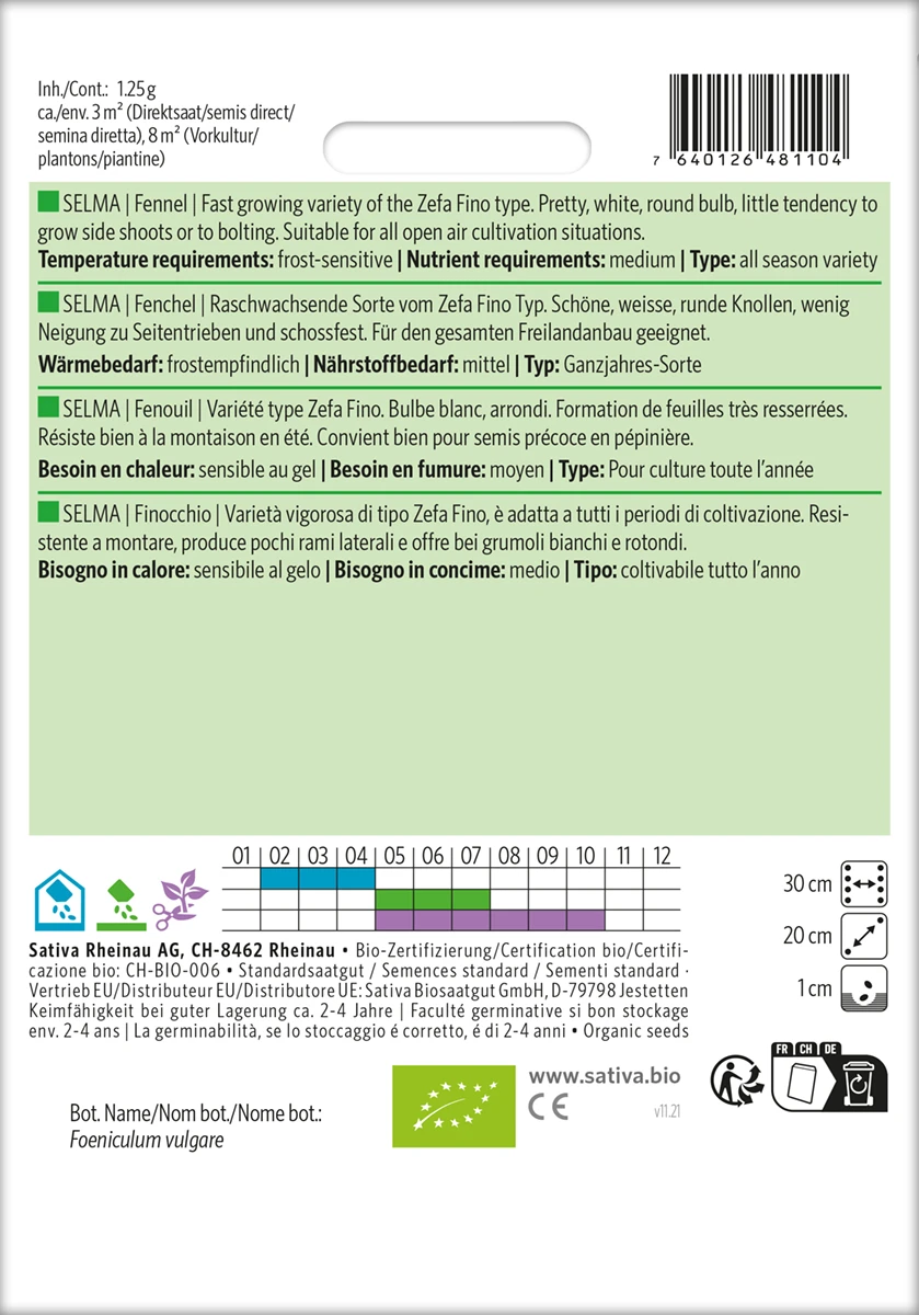 Knollenfenchel kann vom Frühjahr bis zum Herbst angebaut werden. Langsame Jugendentwicklung, evtl. vor Schnecken schützen. Direktsaaten bringen oft die schöneren Knollen, sind aber nur für den Herbstanbau zu empfehlen.