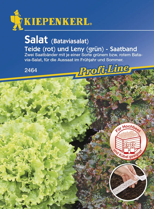 Zwei Saatbänder mit je einer Sorte grünem bzw. rotem Batavia-Salat. Diese beiden schoßfesten Batavia-Salate eignen sich für den Anbau im Freiland vom Frühjahr bis zum Herbst.