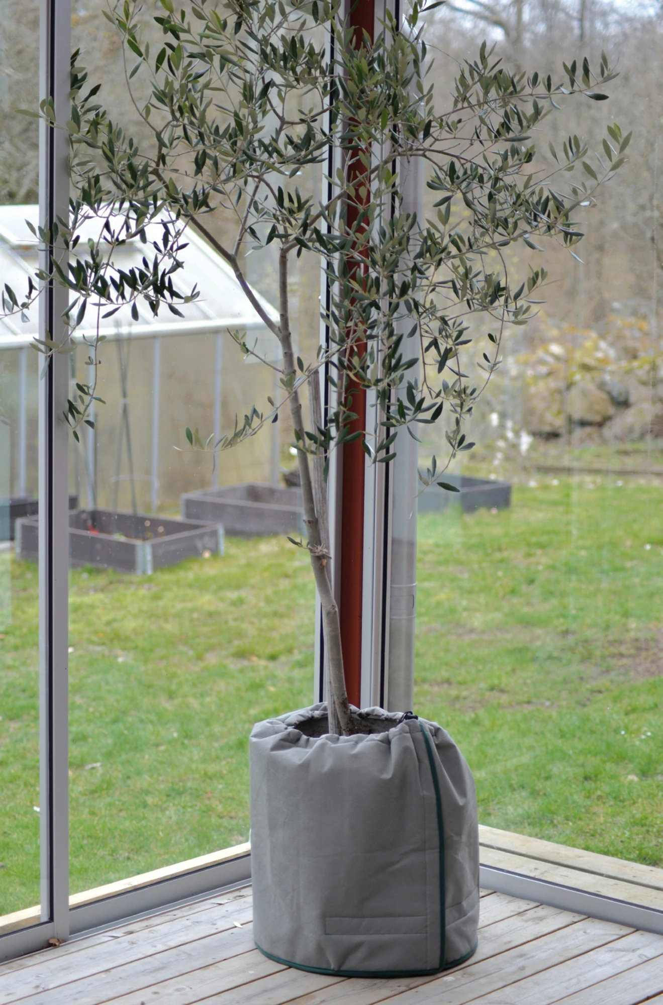 Isolierender Winterschutz für Pflanzen in Töpfen auf z.B. Balkonen. Mit Klettverschluss und Kordelzug. Mit drei Schutzschichten aus Polyproplyen (PP), 100g/m² bzw. 30g/m² und Polyethylen (PE). Boden aus 4cm dickem Styropor. Höhe 50cm, Ø 45 cm.