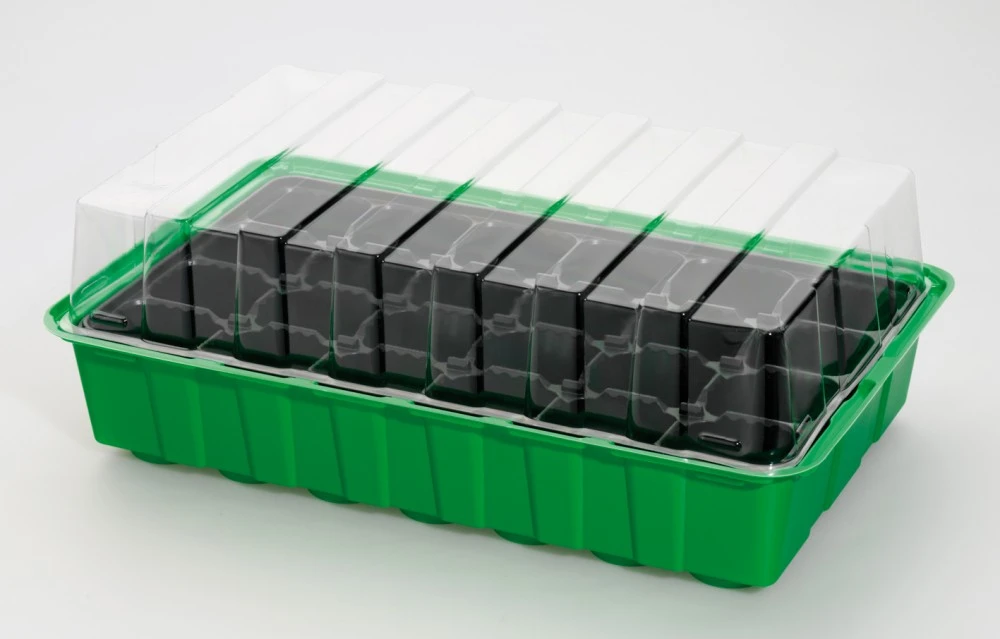Schale mit Vertiefungen für Kokos – Quelltabletten und Rinnen zur optimalen Wasserverteilung.