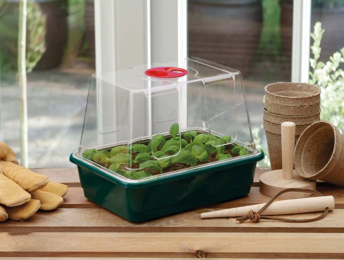 Das Zimmergewächshaus-Set, mit der hohen Haube, bietet den Samen längere Entwicklungsdauer im Anzuchthaus. Dieses Set ist 3-teilig und ist aus stabilem, spritzgegossenem, kristallklarem Material hergestellt. Die Haube ist mit einer praktischen Belüftungsscheibe versehen, mit der Sie die Luftzirkulation und die Temperatur selbst anpassen können. Darüber hinaus sorgt die Haube dafür, dass Schädlinge nicht in die Nähe der jungen Pflanzen/Samen gelangen. Das Anzuchthaus ist in vier Größen erhältlich. Alle Produkte sind pflegeleicht und einfach zu reinigen.