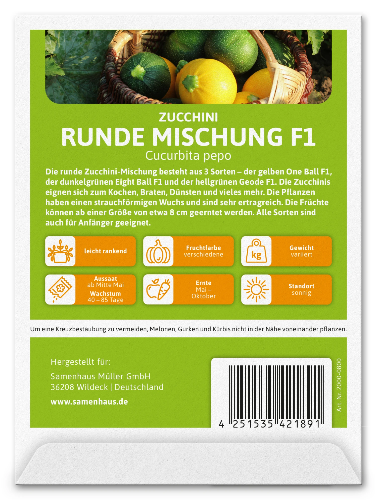 Die runde Zucchini-Mischung besteht aus 3 Sorten – der gelben One Ball F1, der dunkelgrünen Eight Ball F1 und der hellgrünen Geode F1. Die Zucchinis eignen sich zum Kochen, Braten, Dünsten und vieles mehr. Die Pflanzen haben einen strauchförmigen Wuchs und sind sehr ertragreich. Die Früchte können ab einer Größe von etwa 8 cm geerntet werden. Alle Sorten sind auch für Anfänger geeignet.